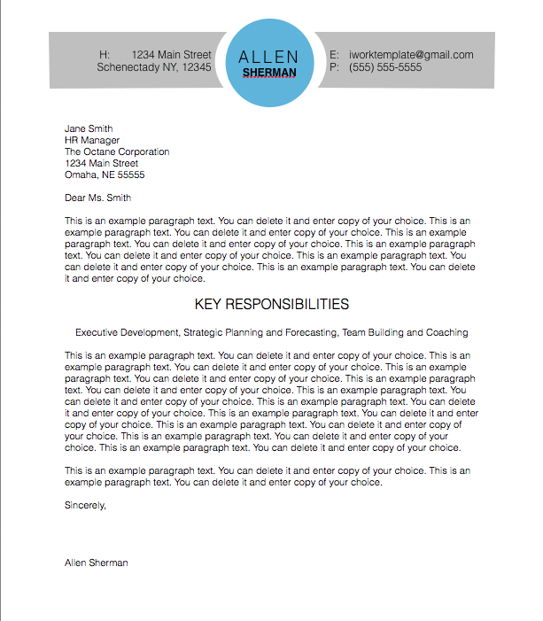 This cover letter template is designed to complement the Modern Circle Resume Template . Its professional and has just enough pizzazz to get you noticed. Simply replace the example copy with your own information and write a wonderful letter explaining yourself to your future employer and they are sure to look you over. Hopefully this cover letter will help you land the job of your dreams.